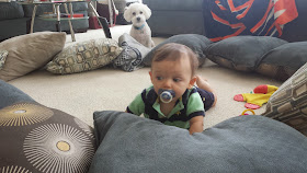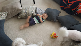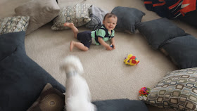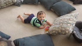 I was watching him a bit at my house while Missy took a nap.  He's doing this army crawl type thing so I got all the pillows from the couches and made a circle.  He didn't mind too much.