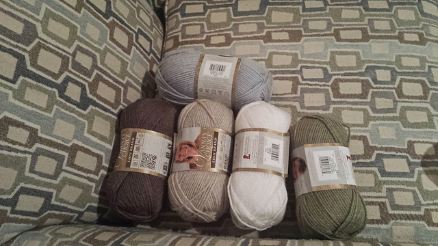 The colors are Silver Blue, Taupe, Linen, White, and Dusty Green. Only after I took this photo did I realize that they matched my chair and pillows perfectly. I might have to later use this yarn for something for my living room.